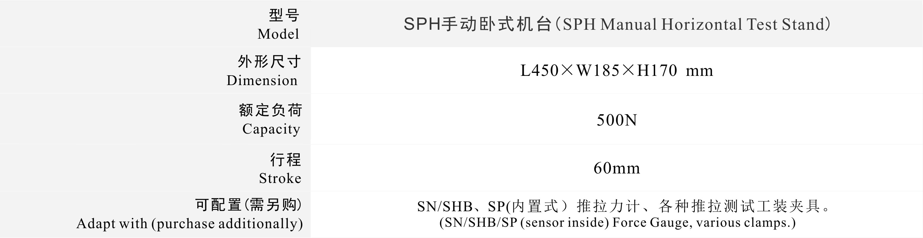SPH手動(dòng)臥式機(jī)臺(tái)配備推拉力計(jì),機(jī)臺(tái)設(shè)有工裝夾具適用于各行業(yè)和科研機(jī)構(gòu)作拉壓負(fù)荷、插拔力、水平剝離、破壞試驗(yàn)等測(cè)試。本機(jī)架可安放在各種工作臺(tái)面上使用,具備手動(dòng)操作、簡(jiǎn)單穩(wěn)定等特點(diǎn)。