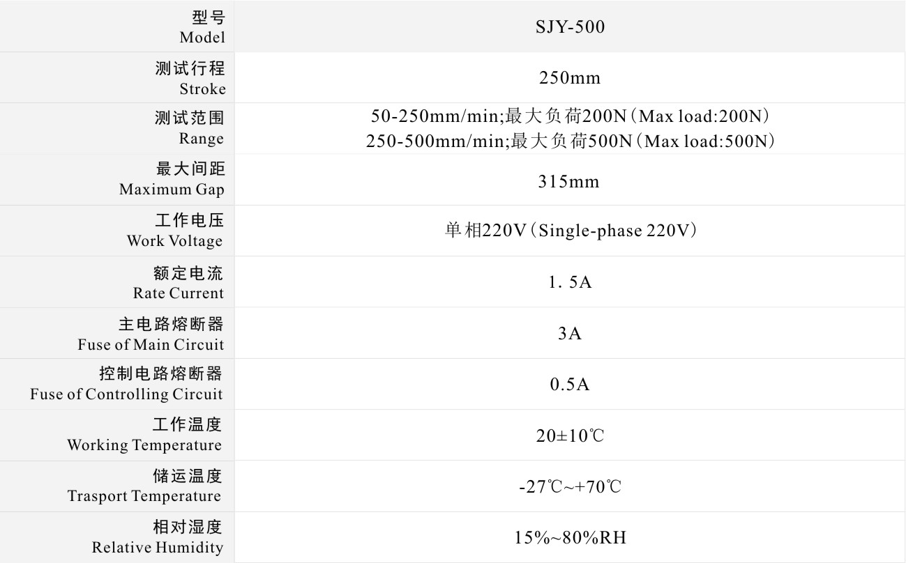 測試速度:50-250mm/min,最大負荷200N;250-500mm/min,最大負荷500N