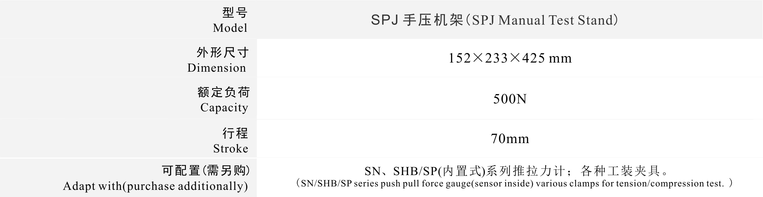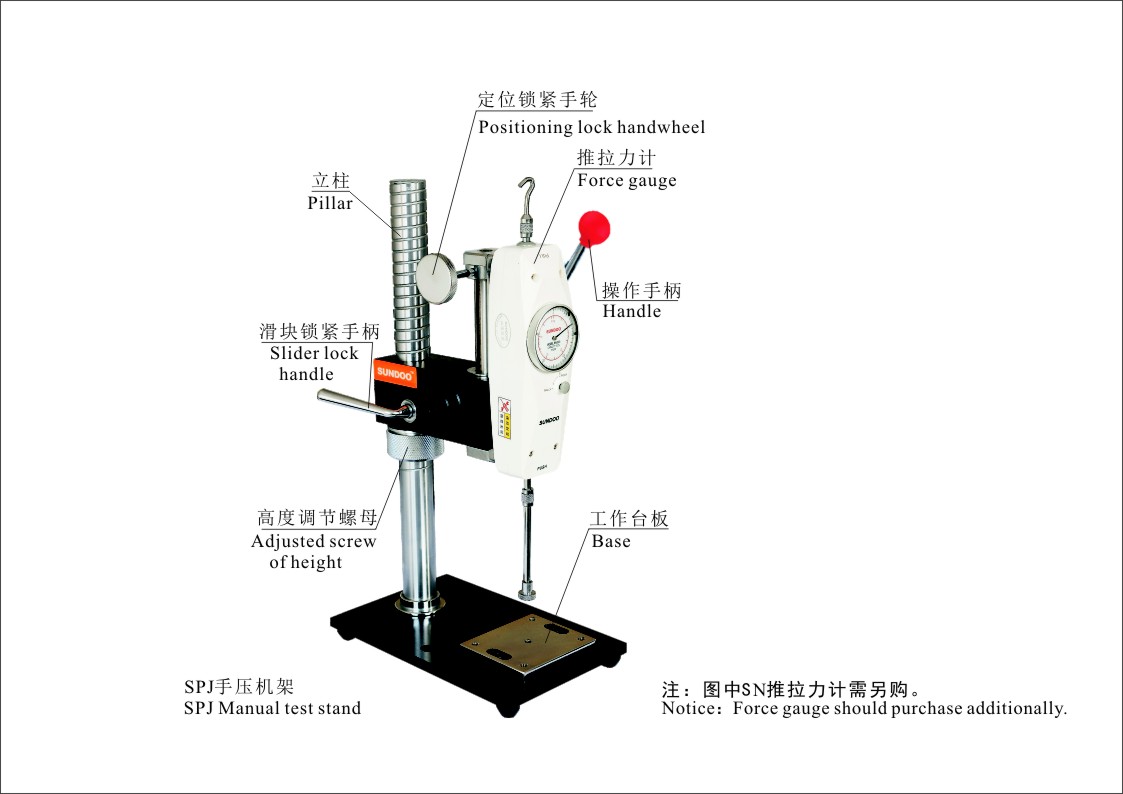 SPJ手壓機(jī)架配備推拉力計(jì)。適用于各行業(yè)和科研機(jī)構(gòu)作拉壓負(fù)荷、插拔力、破壞試驗(yàn)測(cè)試。機(jī)架采用齒輪副傳動(dòng),手壓式操作,機(jī)架上下高度可調(diào)節(jié),測(cè)力計(jì)上下移動(dòng)設(shè)有定位結(jié)構(gòu),具備手動(dòng)操作、簡(jiǎn)單穩(wěn)定、快速高效、適合批量測(cè)試。