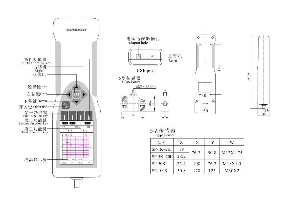 TFT真彩屏幕,峰值、實時值、測試過程曲線同屏顯示,可監(jiān)控和追朔測試過程;顯示屏240×320像素TFT65535色; |