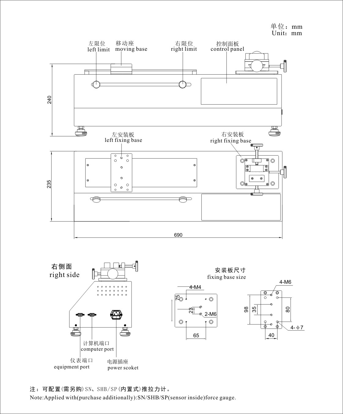 SJS-500H步進電動臥式機臺采用雙導(dǎo)桿結(jié)構(gòu),配置步進電機。本機臺具有結(jié)構(gòu)穩(wěn)定,測試速度精度高,施加負載穩(wěn)定性好,適用范圍廣等優(yōu)點。具有無極調(diào)速,手動(點動)、自動循環(huán)切換功能。配置推拉力計(SHB、SP)及相關(guān)軟件可以在計算機上實現(xiàn)數(shù)據(jù)測試和機臺控制;適用于各行業(yè)推拉負荷、插拔力、疲勞試驗、破壞試驗等測試。